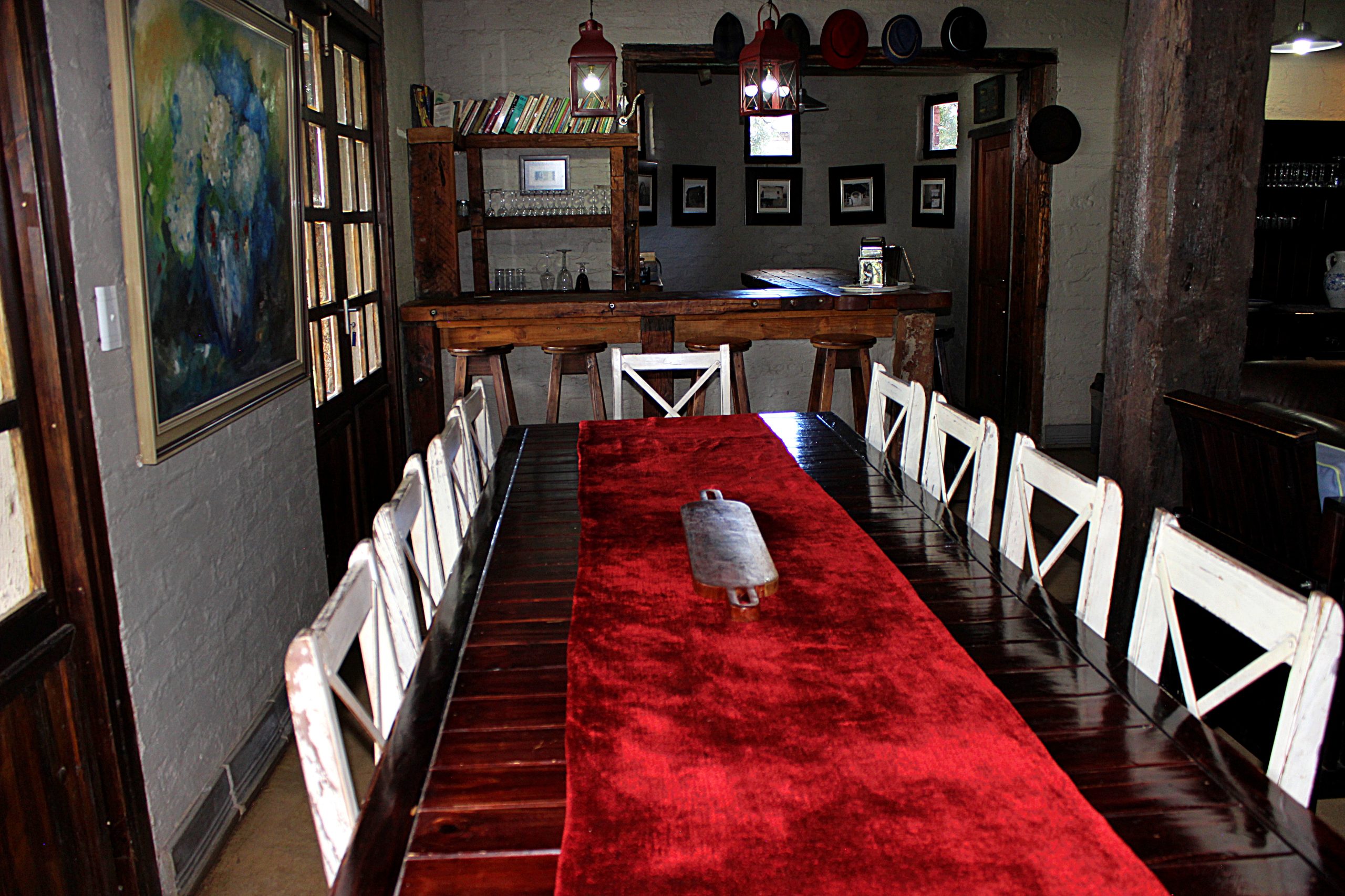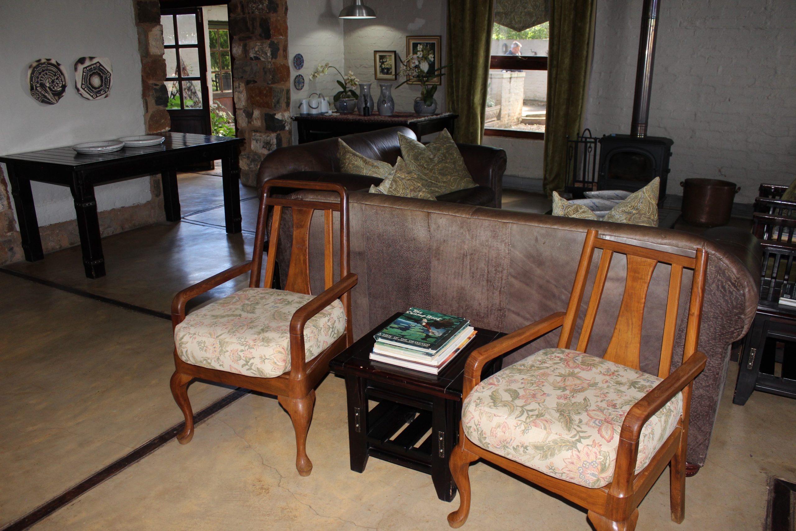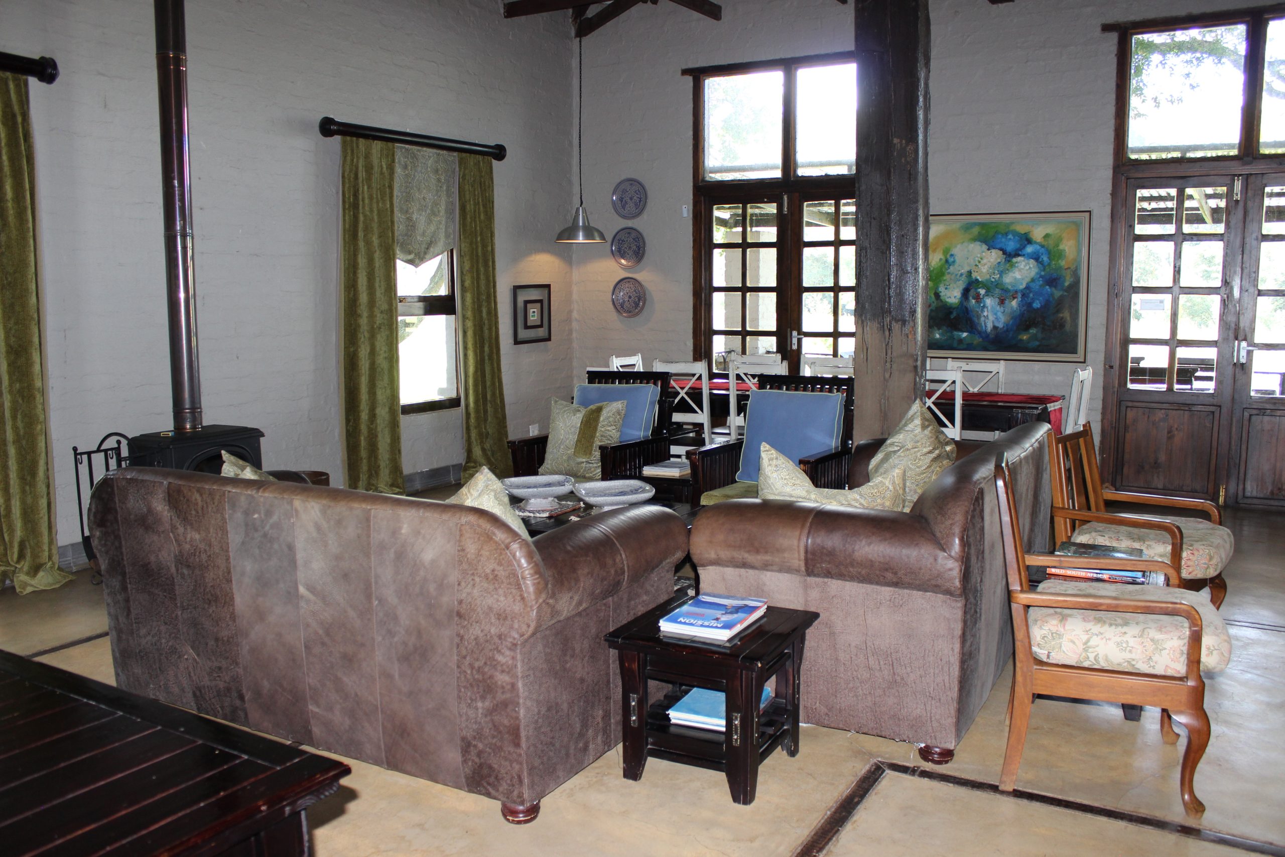 The spacious lounge with the sociable "Hemel en Aarde" bar shares an open fireplace with the adjacent dining room and kitchen. The living area opens onto a verandah with a well-equipped built-in braai, overlooking a trout dam and impressive mountain range.